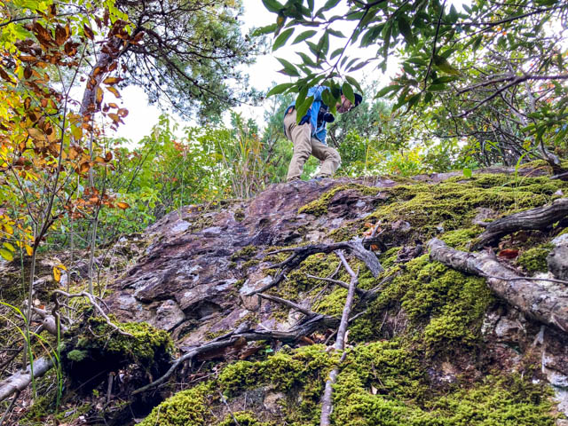 真山は山城愛好者も多いのだろう、登山道はととのっており登りやすかった。45分ほどで標高256メートルの真山城本丸跡に着いた。さらにおよそ30分で鳥ノ子山(標高252メートル)についた。おや?天狗岩は、どこにあるのだ。途中に小さな岩場はあったが、、、。まさかあの岩かもしれない。と大急ぎで引き返す。これかもしれないと二人で見下ろした岩は長さ2メートル、幅1メートルほどの岩である。足元の岩だから大きく感じなかったが、岩の上から下を覗き込んでみると、相当下の方まで岩である。これかもしれないと、知り合いも岩の下に回り込んでくれて、「これに間違いないでしょう。かなり大きいですよ。」と。二人で下から登ってみたが、まさに幅7メートル、高さ10メートルぐらいで、これが天狗岩だと確信した。ここから遠くに日本海が見える。また、ほぼ真北に7キロメートルのところに兄妹神の神話の伝わる加賀の潜戸がある。なにか海と関係する人々の信仰の跡なのではないか、とロマンが広がった。